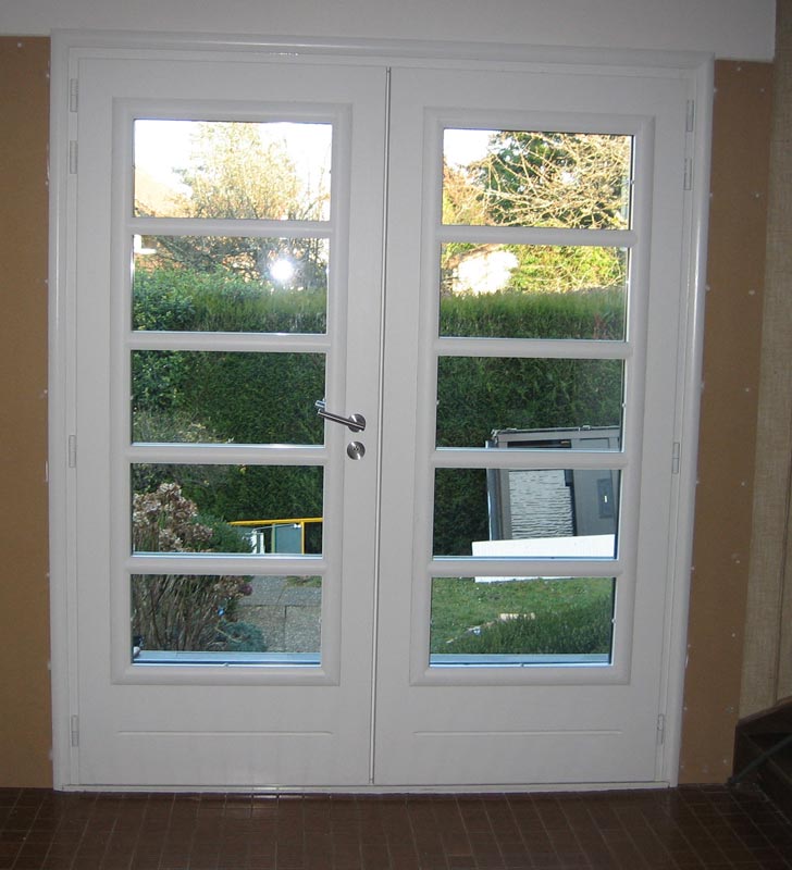 | Baie coulissante bois-aluminium | Porte entrée en Chêne massif avec moulures grand cadre |